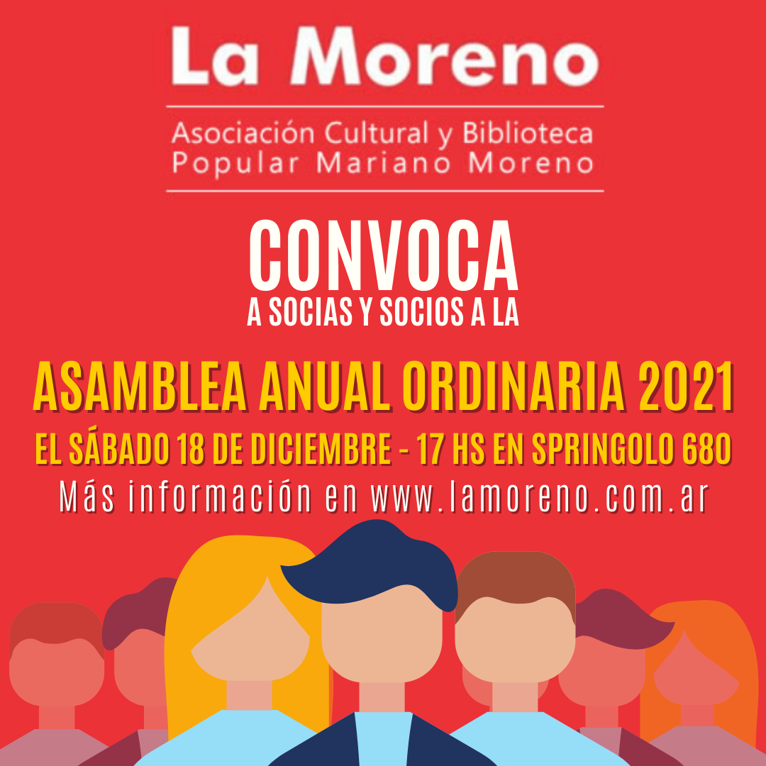 La CD de la asociación cultural y biblioteca popular Mariano Moreno convoca a todos sus asociados a la Asamblea General Ordinaria anual a realizarse el día sábado 18 de diciembre de 2021 a las 17 hs. con el siguiente Orden del día: