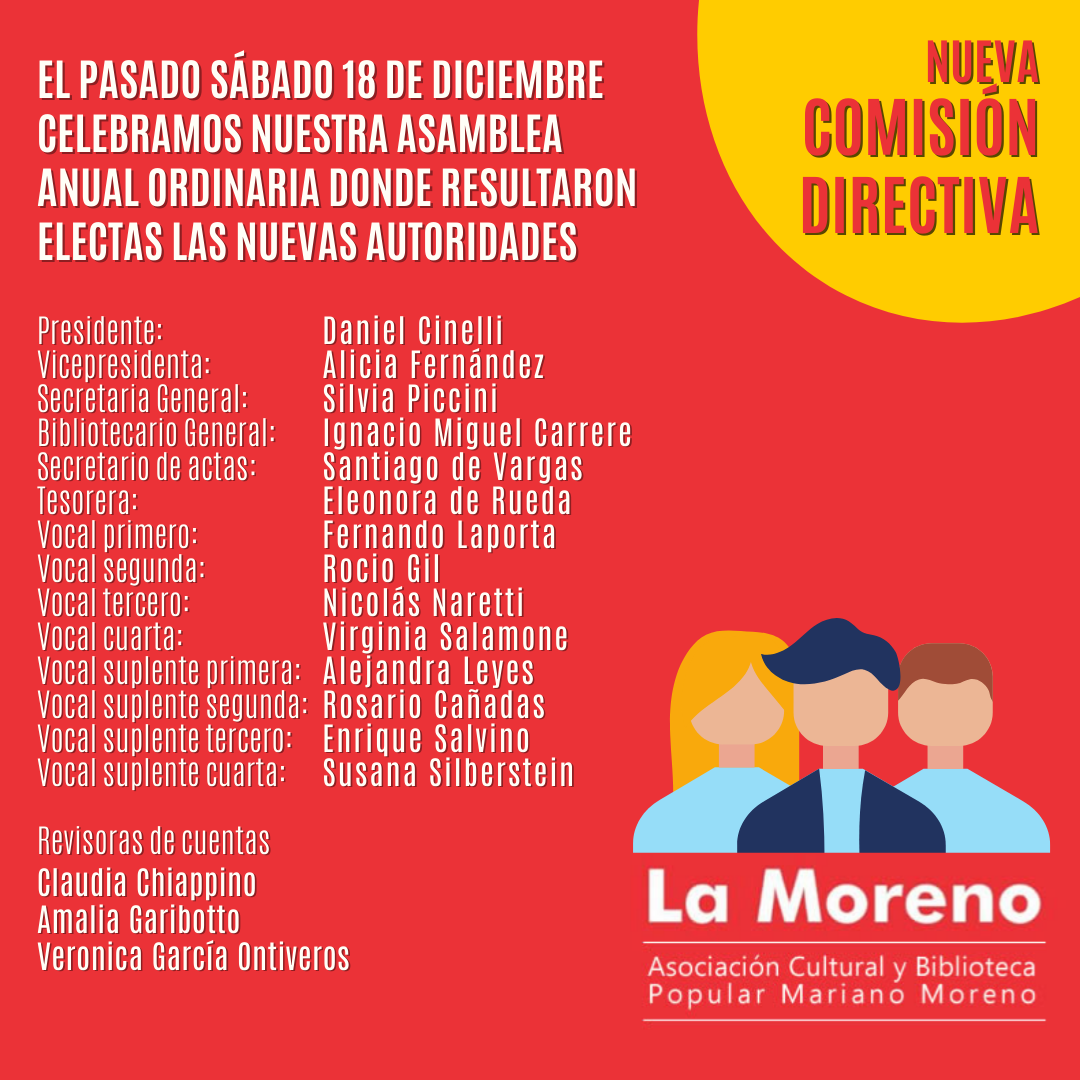 La Comisión Directiva de la Asociación Cultural y Biblioteca Popular Mariano Moreno convoca a todas las personas asociadas a participar de la Asamblea General Ordinaria anual a realizarse el día lunes 19 de diciembre de 2022 a las 20 hs en Spríngolo 680, Sáenz Peña