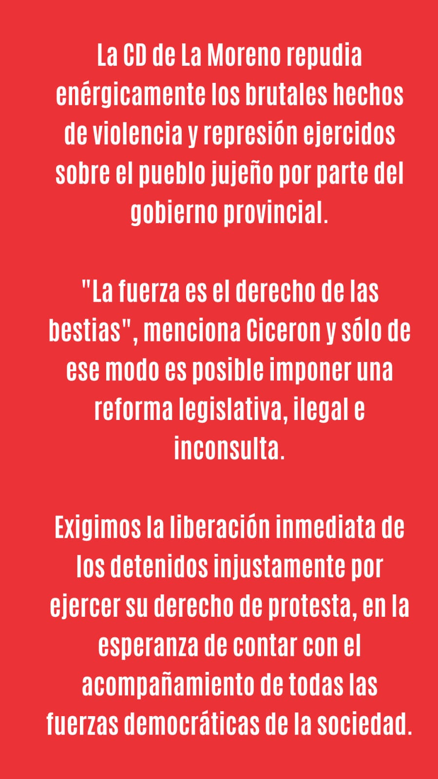 La CD de La Moreno repudia enérgicamente los brutales hechos de violencia y represión ejercidos sobre el pueblo jujeño por parte del gobierno provincial.