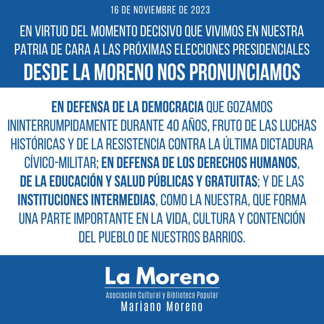 En virtud del momento decisivo que vivimos en nuestra patria de cara a las próximas elecciones presidenciales desde La Moreno nos pronunciamos