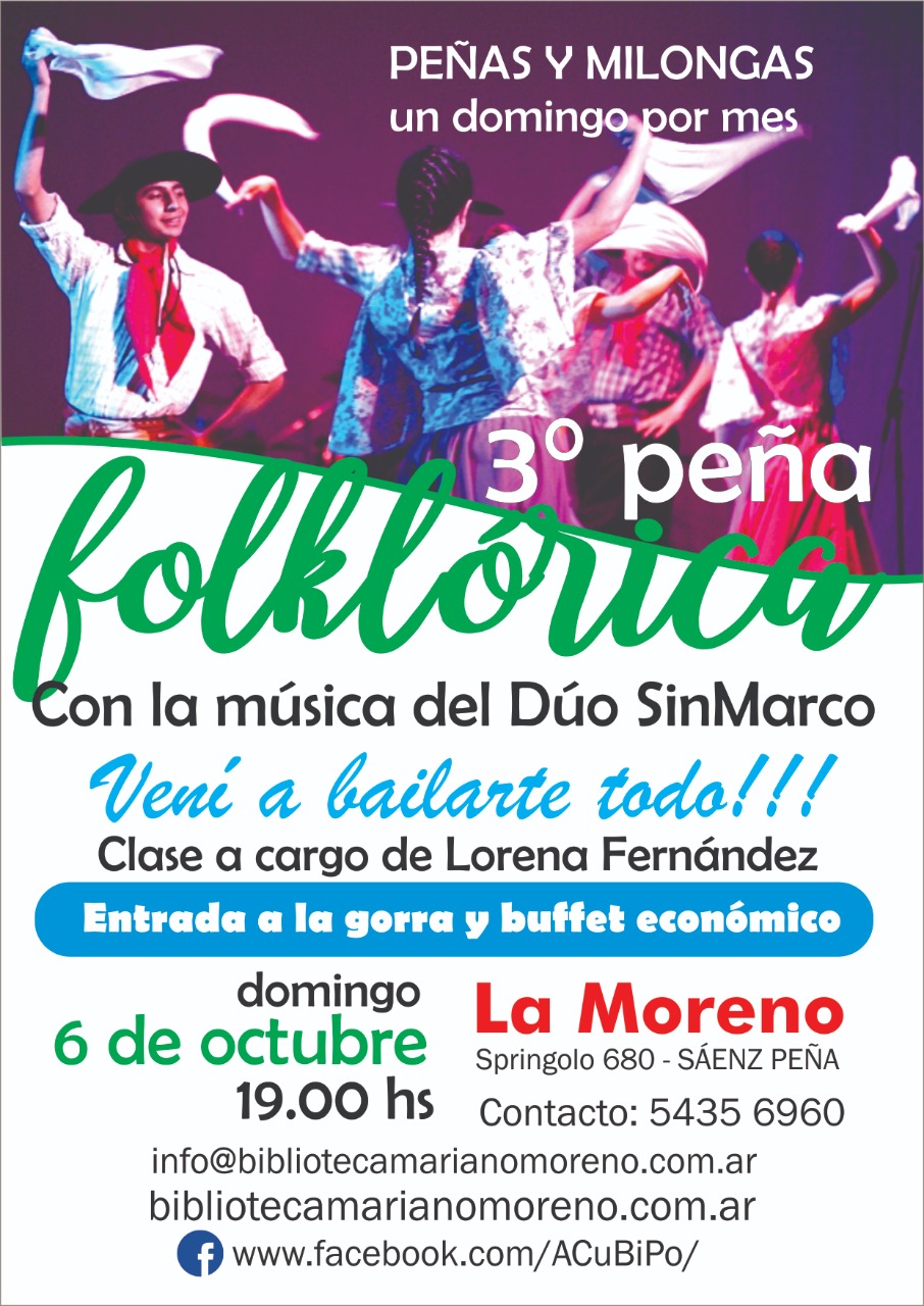 30 septiembre, 2019 3er Peña Folklorica Por Biblioteca Mariano Moreno en Eventos Etiqueta baile, buffet, Comida, duo sin marcos, folklore, Musica, Socios, Vecinos